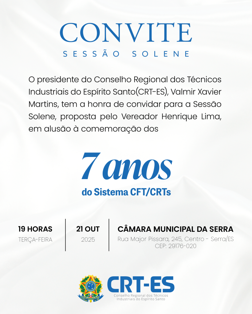 Em comemoração aos sete anos de criação do Sistema CFT/CRTs, será realizada nesta terça-feira, 21 de outubro, às 19 horas, uma Sessão Solene na Câmara Municipal da Serra, em Serra Sede. A homenagem, proposta pelo vereador Henrique Lima, reconhece a importância dos técnicos industriais para o desenvolvimento do Espírito Santo e do Brasil.